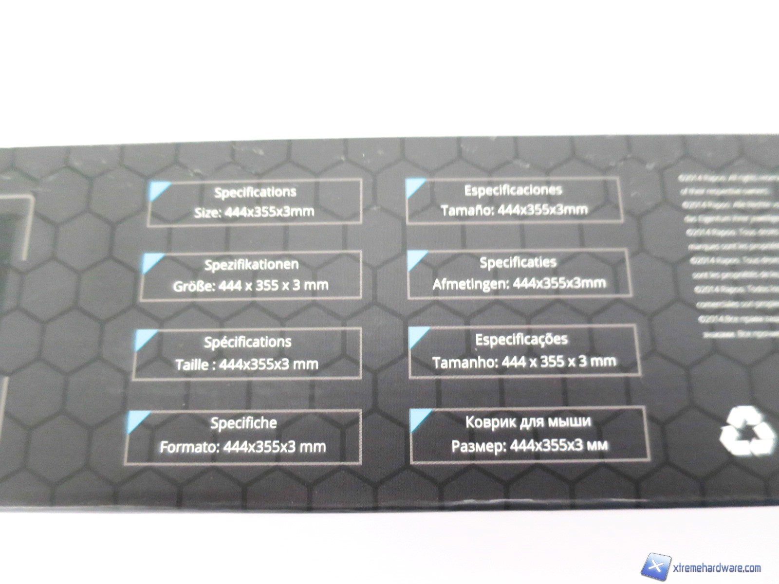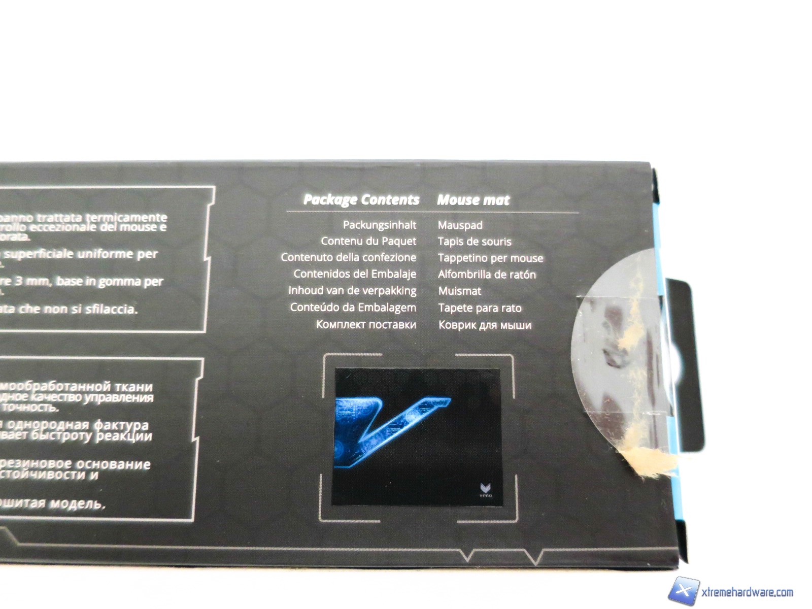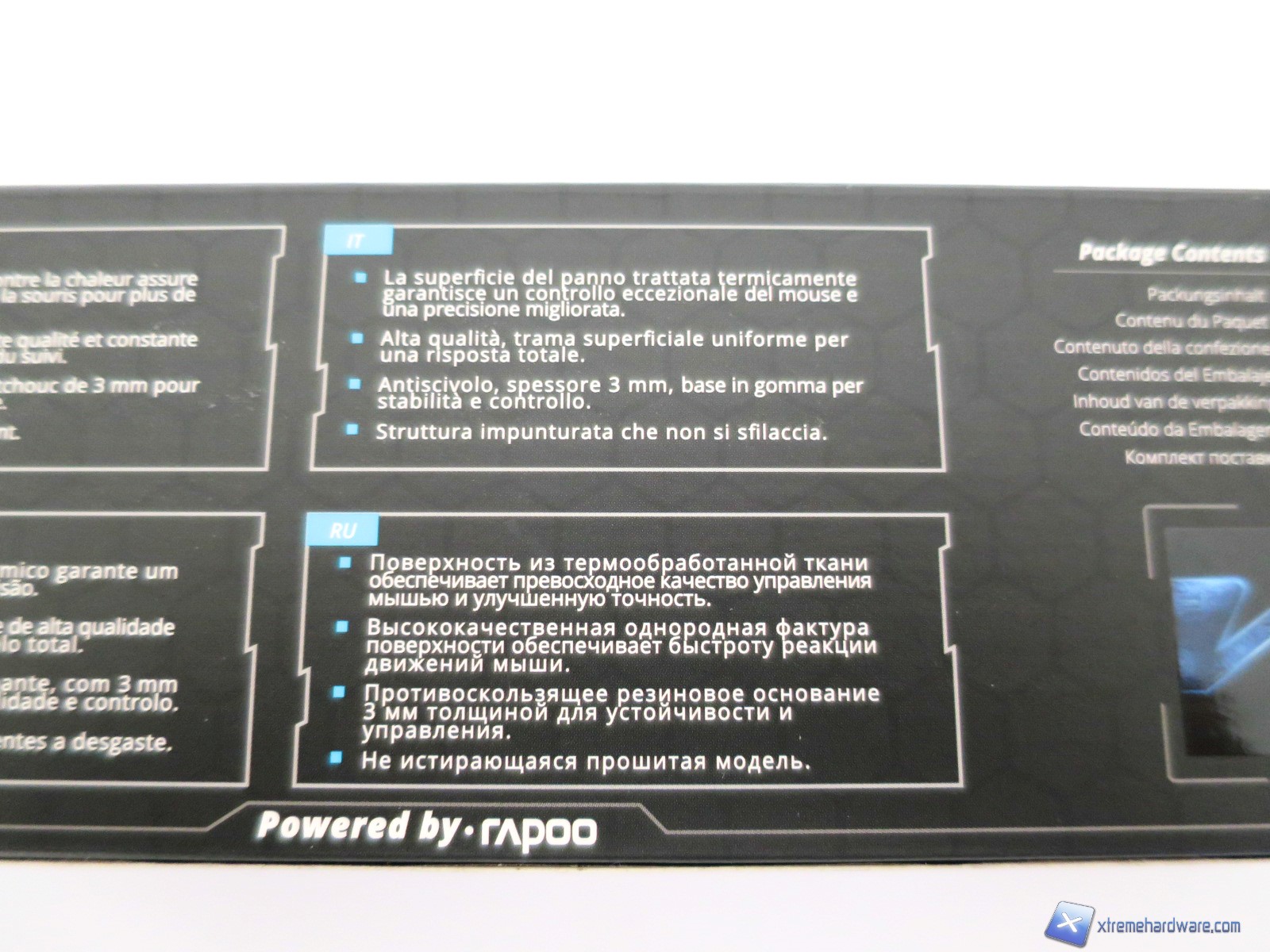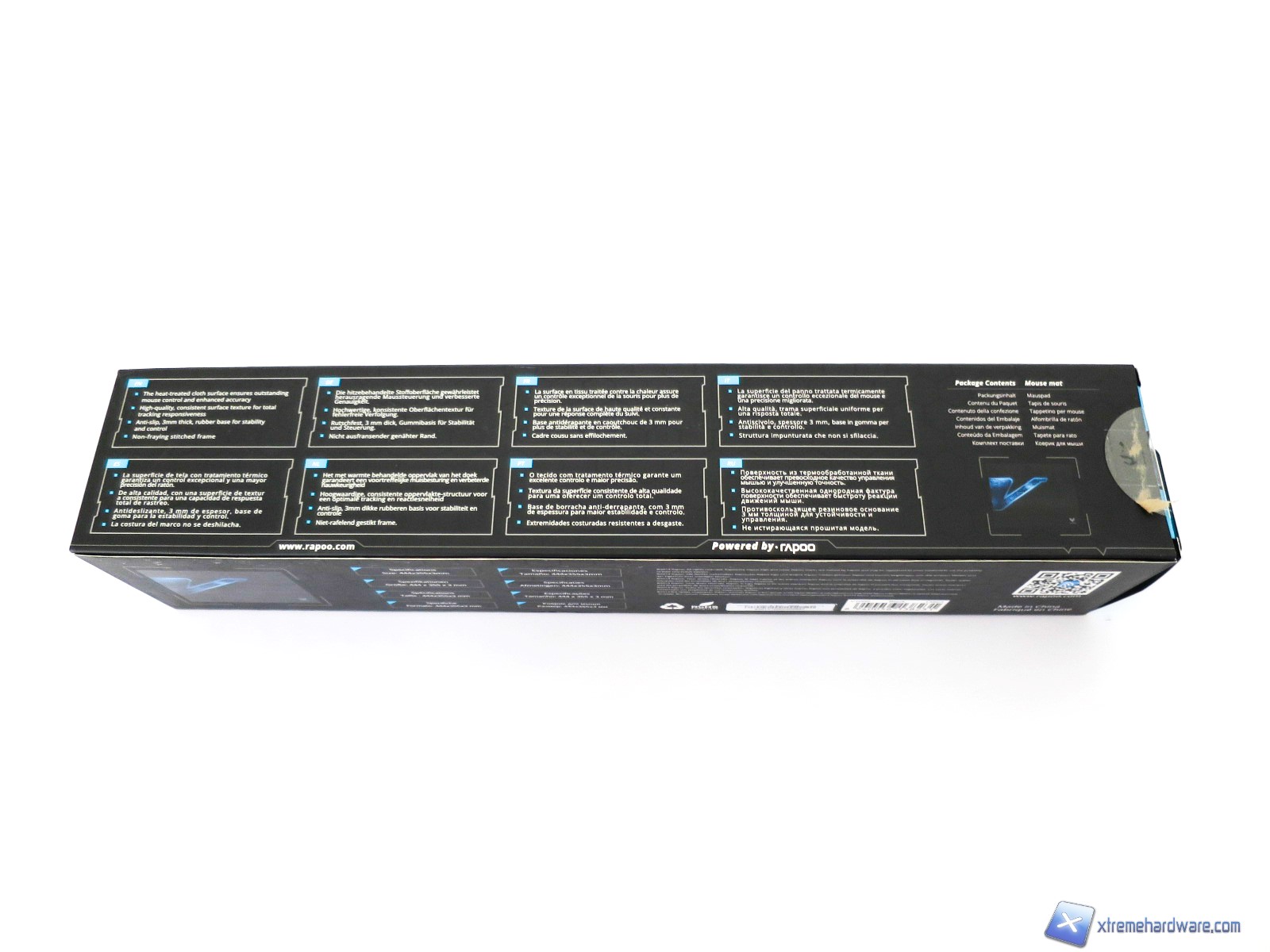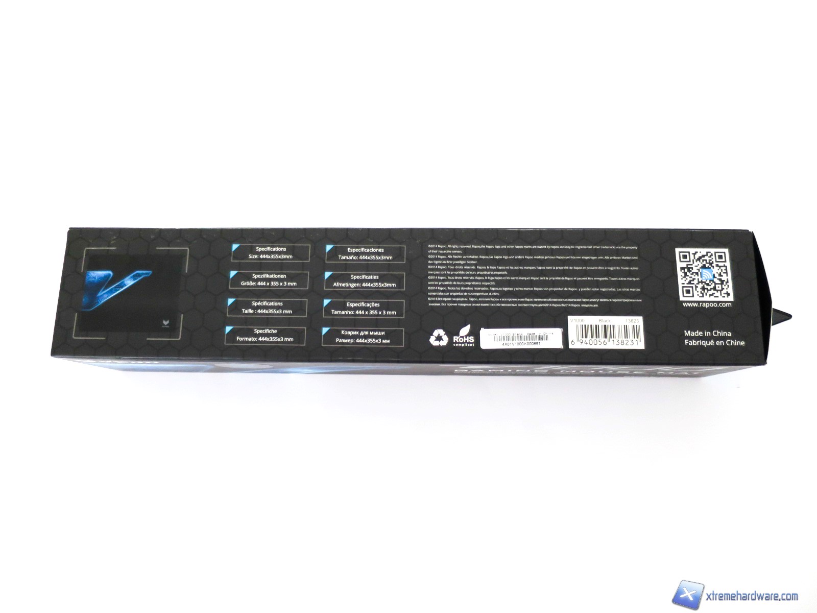 Confezione realizzata in cartone rigido come molte altre che contengono mousepad in tessuto. La confezione è caratterizzata da una completa serie di informazioni ed immagini illustrative del prodotto. Troviamo tutte le informazioni necessarie e le descrizioni del prodotto in varie lingue. Stranamente la confezione del Rapoo V1000 non è dotata della classica apertura circolare o quadrata che ci permette di “provare” a scatola chiusa la superficie in tessuto del mousepad. Non è una pecca essendo un semplice mousepad in tessuto ma poteva comunque far comodo.