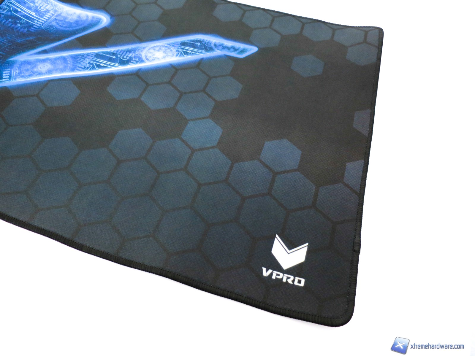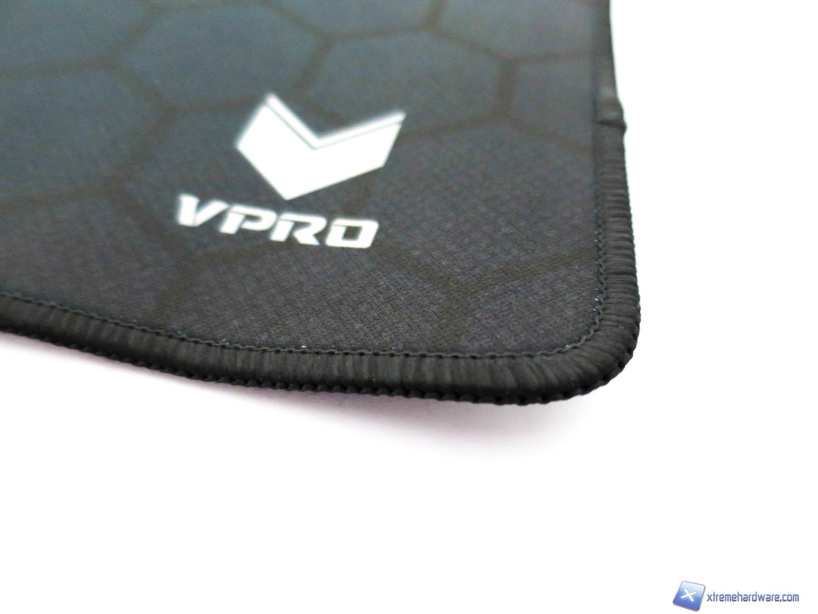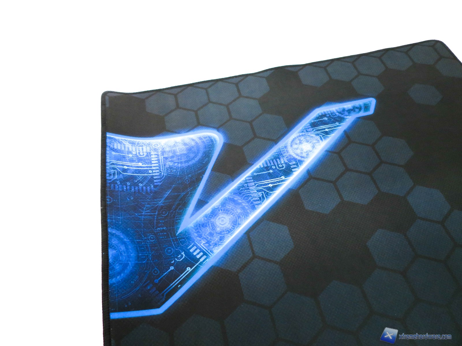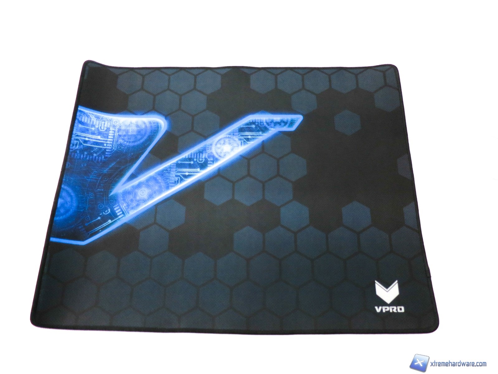 Notiamo immediatamente la classica colorazione del brand; anche il disegno presente sul mousepad riprende colori e schema tipici di Rapoo. Le dimensioni sono di 444 x 355 millimetri con uno spessore tipico di molti altri mousepad, ovvero 3 millimetri. Il disegno sul mousepad è la V indice del brand VPRO e contornata da un disegno a texture alveolare.