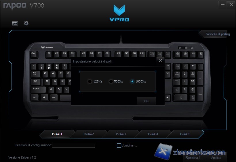 La schermata principale del software si presenta con l’immagine della tastiera dalla quale potremo assegnare una qualunque funzione su praticamente ogni tanto salvo i quattro tasti “speciali” presenti in alto a destra. Per assegnare una qualsiasi funzione ad un tasto ci basterà selezionarlo e cliccarci sopra. Subito vi comparirà un ulteriore menù dal quale poter assegnare una combinazione di tasti, una macro precedentemente registrata, una funzione base o multimediale (come vi avevamo detto potremo dunque personalizzare i tasti da F1 ad F12 come se fossero di default impostati come multimediali) o una funzione avanzata come l’avvio di un programma, apertura di un file, riproduzione di un brano o altro ancora. Inoltre, grazie al tasto di ripristino, potremo eliminare eventuali assegnazioni. Una volta assegnata la funzione desiderata, ci basterà cliccare OK e in tempo reale verrà “caricata” in memoria per un utilizzo immediato. Non abbiamo un dato completo ed esatto di quanto sia lo spazio adibito per il salvataggio di queste modifiche, ma ipotizziamo, vista l’assenza di tasti Macro e Multimediali dedicati, una dimensione di 128KB di memoria on-board. Detto ciò, dalla schermata principale potremo creare fino a 5 profili, che purtroppo dovremo caricare ogni volta manualmente nel caso volessimo switchare da un profilo ad un altro. Funzione leggermente scomoda ma non possiamo chiedere di più visto il prodotto ed il suo prezzo, che vedremo nel capitolo delle conclusioni. Abbiamo inoltre la possibilità di variare il Polling Rate e di avviare le modifiche apportate ai tasti con un dato eseguibile/programma. Quindi in caso di un videogioco avremo subito caricati i tasti assegnati precedentemente senza stare ogni volta a ricreare le configurazioni interne al gioco.