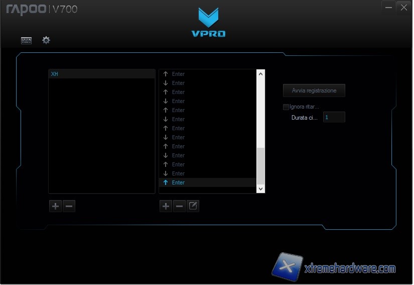 Essendo un software davvero basilare e semplice, abbiamo a nostra disposizione solo un altro Menù rappresentato dall’icona a forma di rotella a lato di quella di tastiera. Da qui potremo creare, editare e cancellare le Macro. Il “manager” per le Macro è davvero base e non abbiamo funzioni avanzate. Potremo solo avviare la registrazione dei tasti sulla tastiera e modificare o eliminare i ritardi di registrazione tra un tasto ed un altro. Essendo una tastiera da gaming, avremmo preferito un software più “completo” o almeno qualche voce in più per rendere completa al 100% la tastiera.