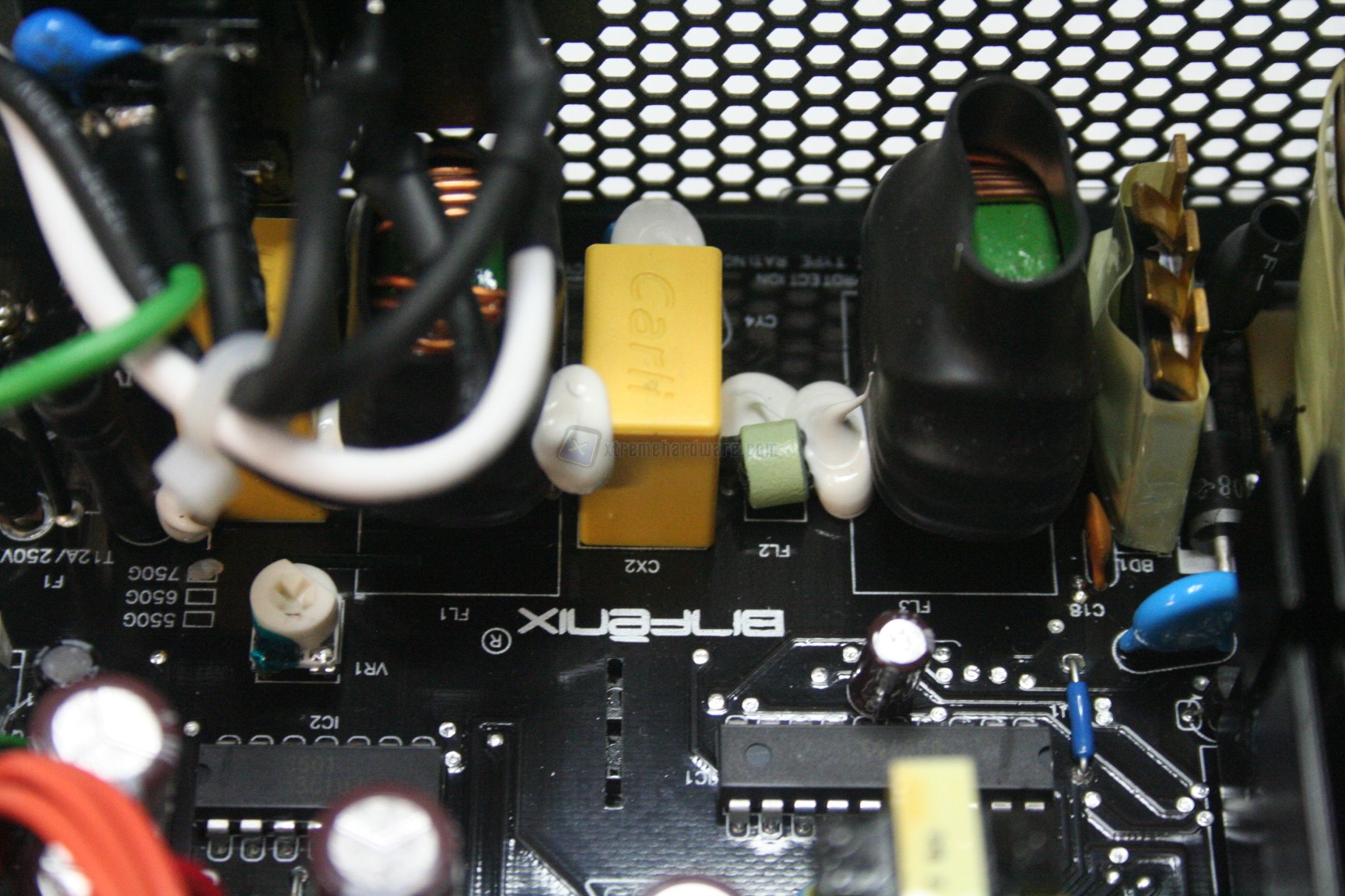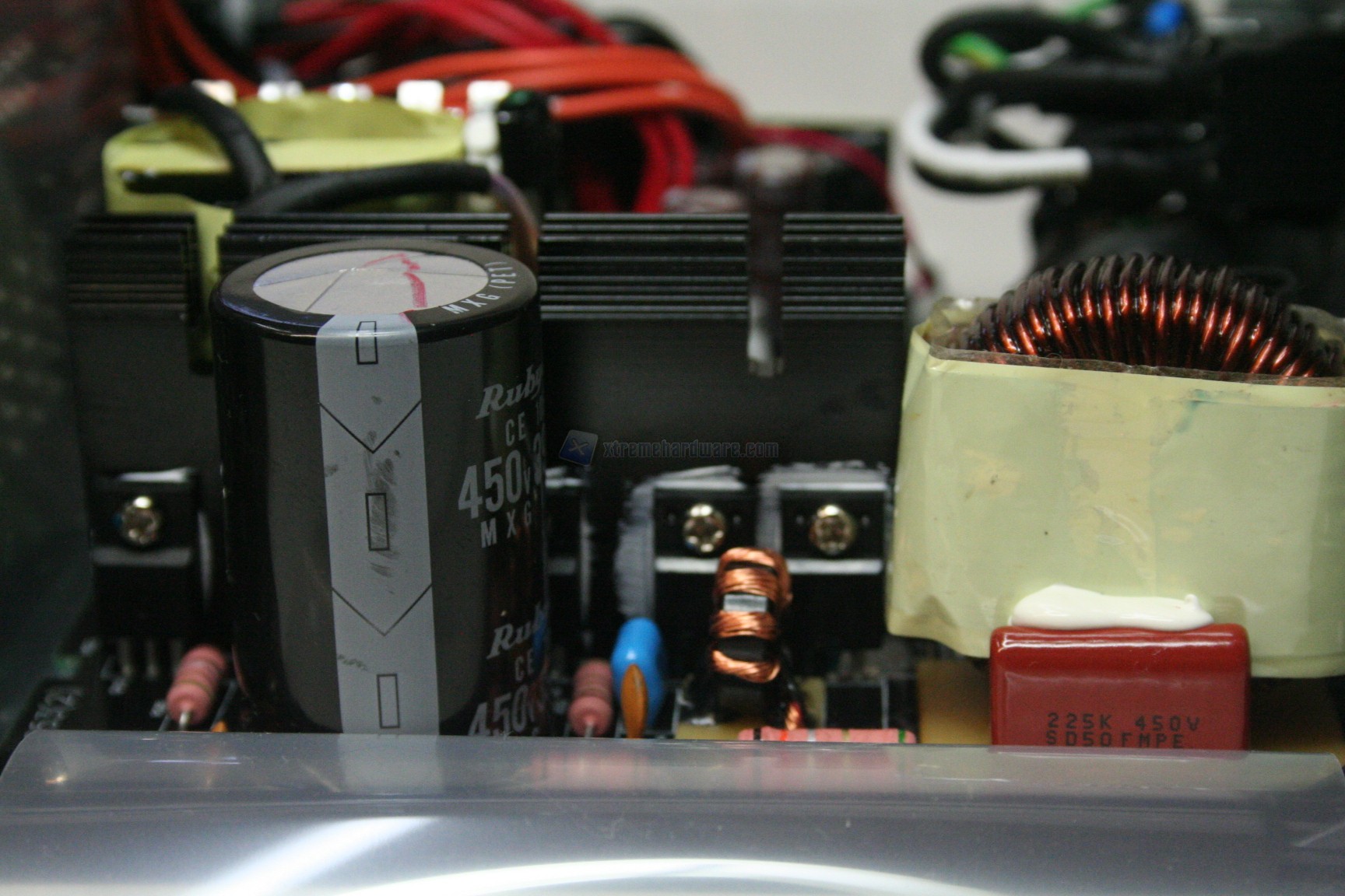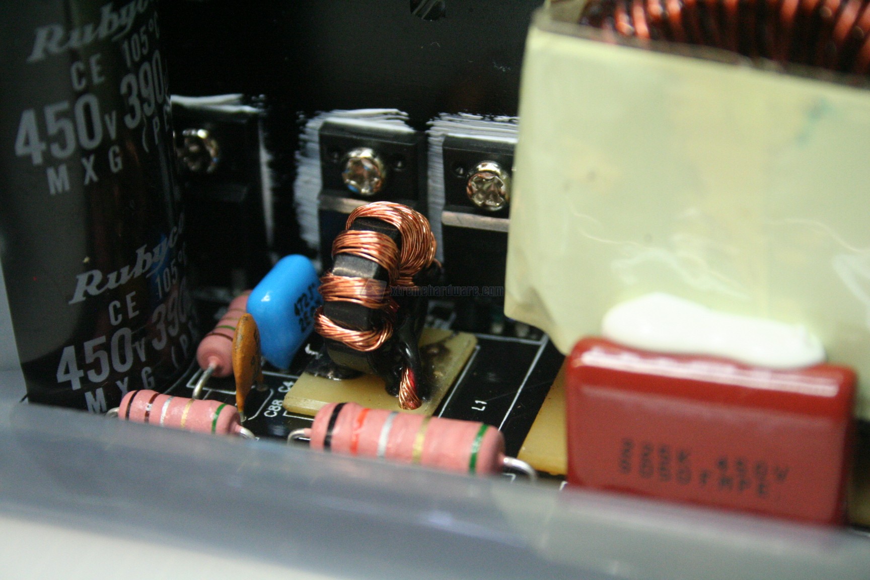 NOTA GENERICA: i condensatori del circuito primario agiscono come buffer e sono molto importanti perché la loro presenza aiuta a proteggere il nostro alimentatore ed il computer stesso da pericolosi sbalzi di tensione e generalmente vengono collegati in parallelo al fine di sommare le singole capacità o, alternativamente, per modelli meno potenti. La tipologia dei condensatori utilizzata è quindi molto importante perché la vita di queste componenti si dimezza in base all’aumento della temperatura di ogni 10 gradi Celsius, sotto un normale carico di lavoro; questo significa che utilizzando modelli di condensatori capaci di gestire, senza il minimo problema anche 105 gradi Celsius, la durata della loro vita potrebbe essere addirittura pari al doppio rispetto a modelli standard da 85 gradi Celsius! Questo fattore è uno dei più sponsorizzati nel campo degli SMPS, non a caso ci si vanta della presenza di condensatori giapponesi nella propria unità, capaci appunto di sopportare temperature maggiori e quindi prolungare la vita stessa dell’unità.