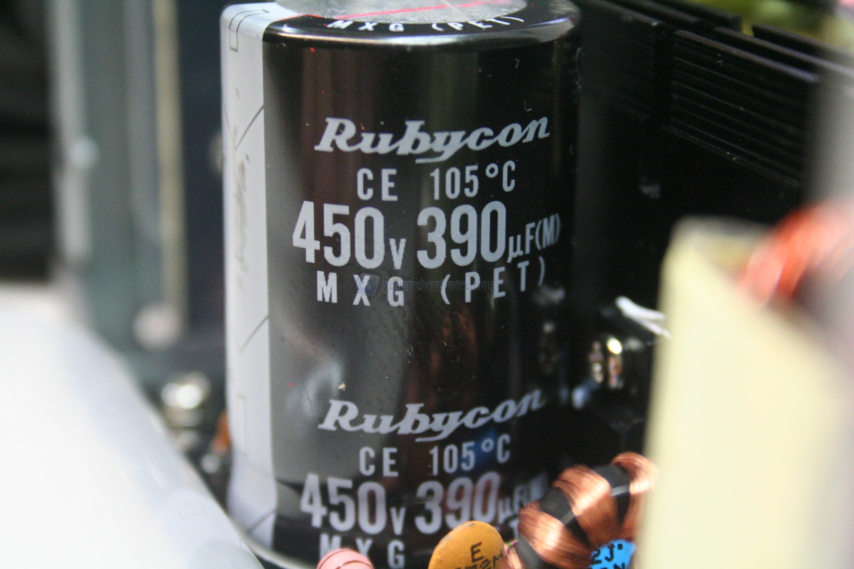 A seguire gli elementi del ponte raddrizzatore, un induttore, dei MOSFET per la Active PFC sul Bridge Rectifier ed un condensatore Rubycon, da 450V e 390μF, certificato a 105°C.