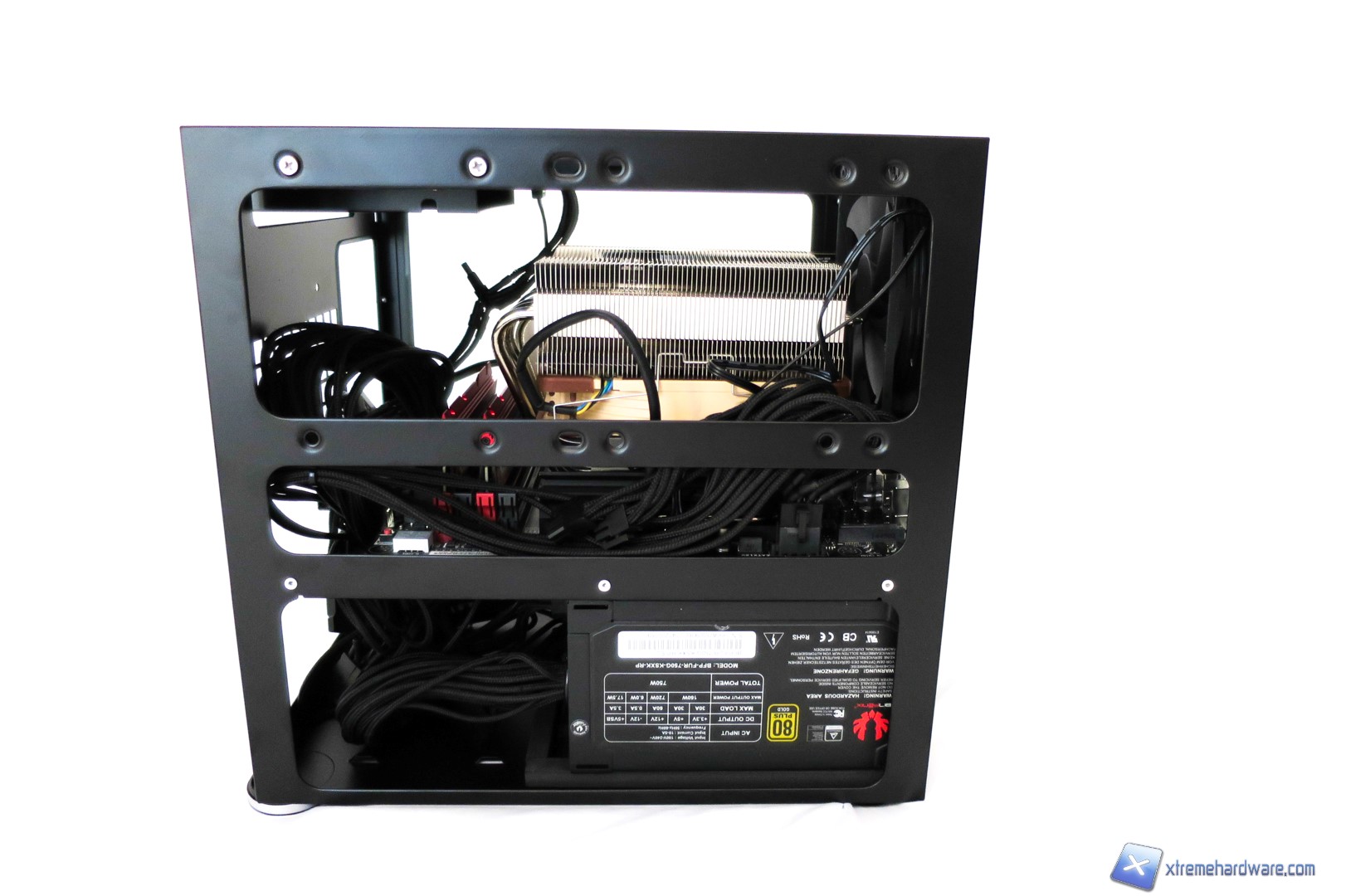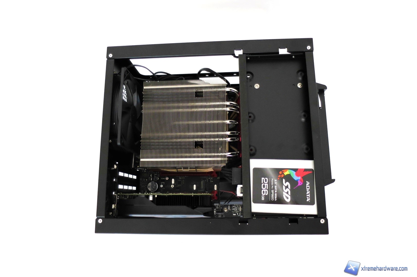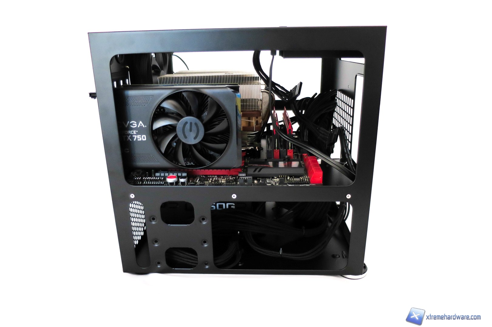 Lo spazio complessivo dell’Antec ISK600M, pur sembrando ridotto è molto valido. Come sempre abbiamo utilizzato la nostra configurazione Z97 questa volta dotata di un generoso dissipatore Noctua della tiplogia Top Down. In questo caso abbiamo installato una EVGA GTX 750 in modo da poter abbinare e provare per qualche giorno, come sempre, il case a lato della nostra TV a LED in salotto come HTPC. Potremo comunque montare diverse VGA anche Custom rispettando sempre le tolleranze del case. Come suggerimento per installare VGA più lunghe vi consigliamo di inserire prima la parte terminale della VGA verso l'interno, trovando il foro che abbiamo visto in precedenza, e solo dopo inserirla nello slot PCIe e avvitarla al case. Lo spazio per il cablaggio di tutti i componenti è valido ed anche con schede video più lunghe non avremo problemi ad effettuarlo. La possibilità di avere lo spazio per l’alimentatore e per le unità di storage nel vano inferiore permetterà di avere piena manovra durante il cablaggio e l’installazione dei componenti.