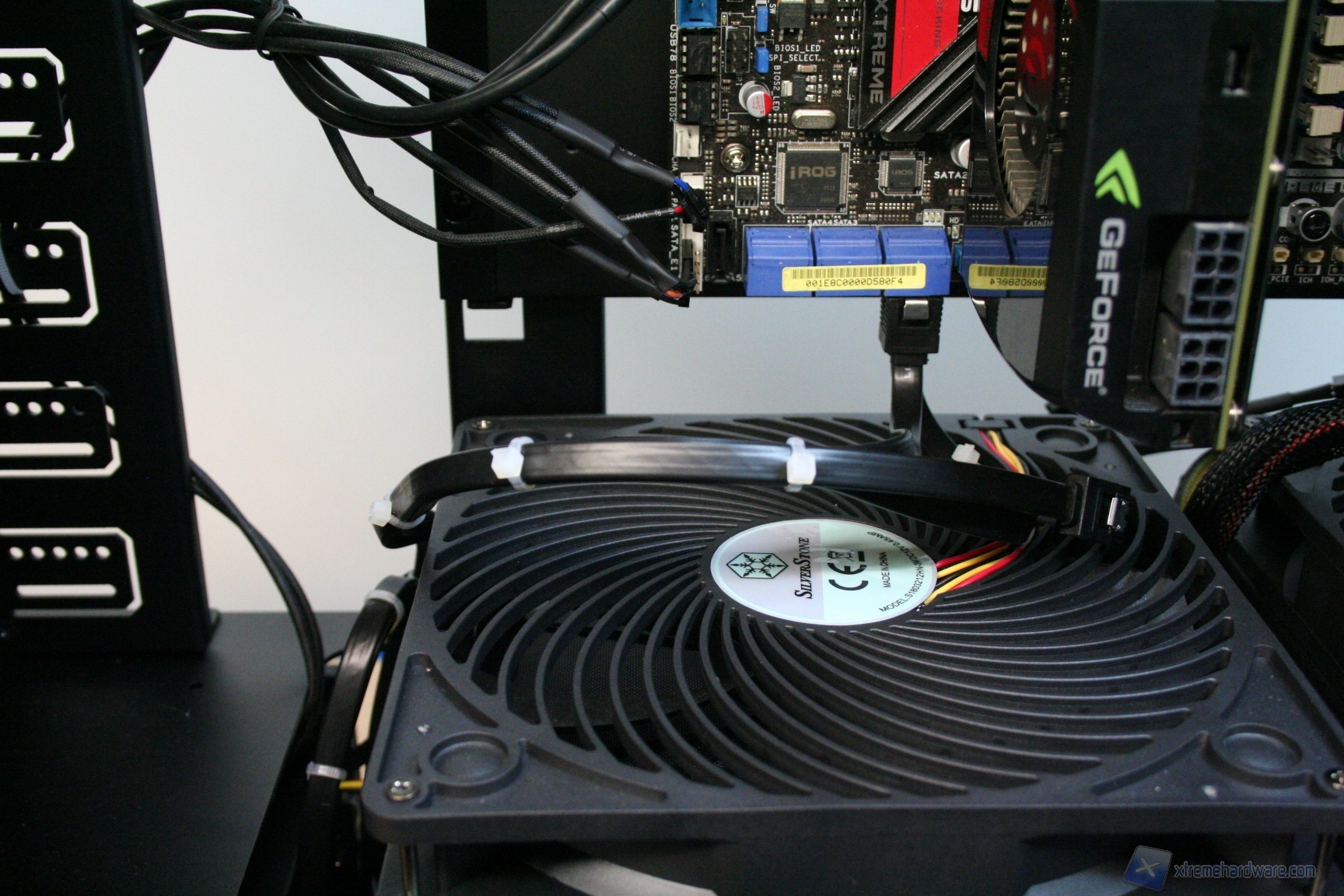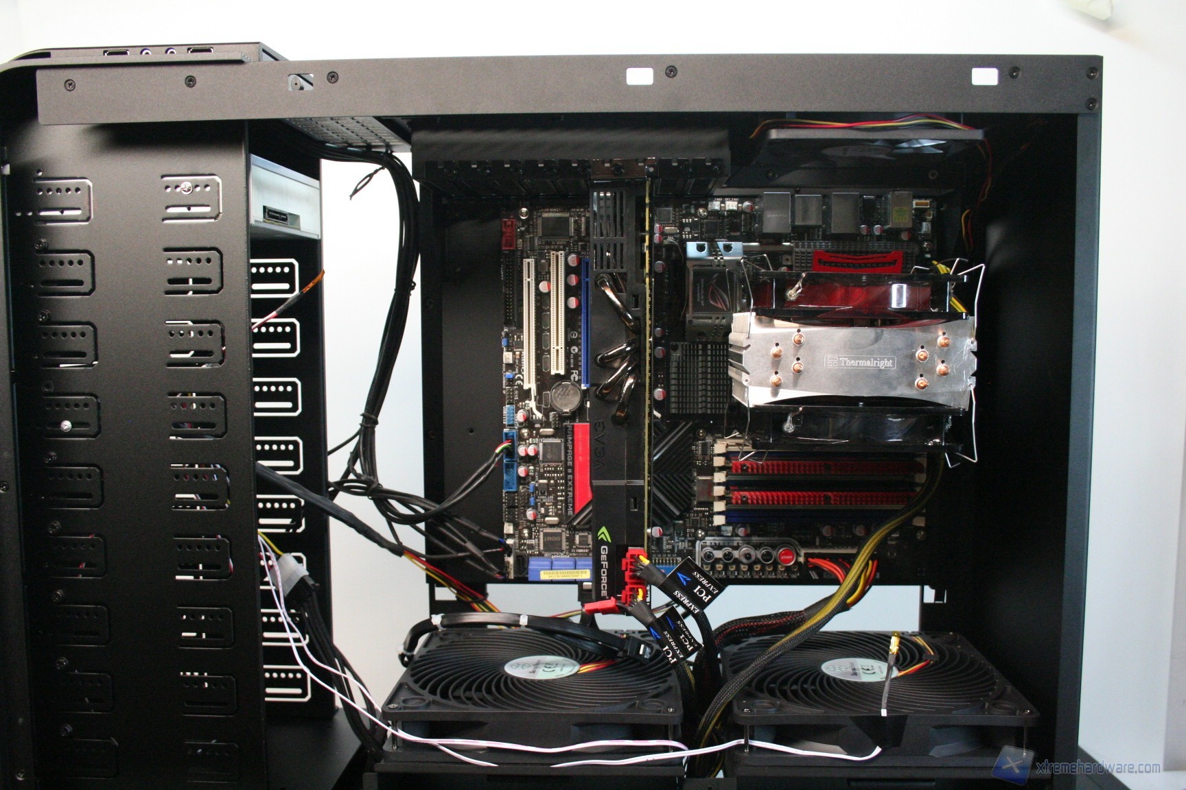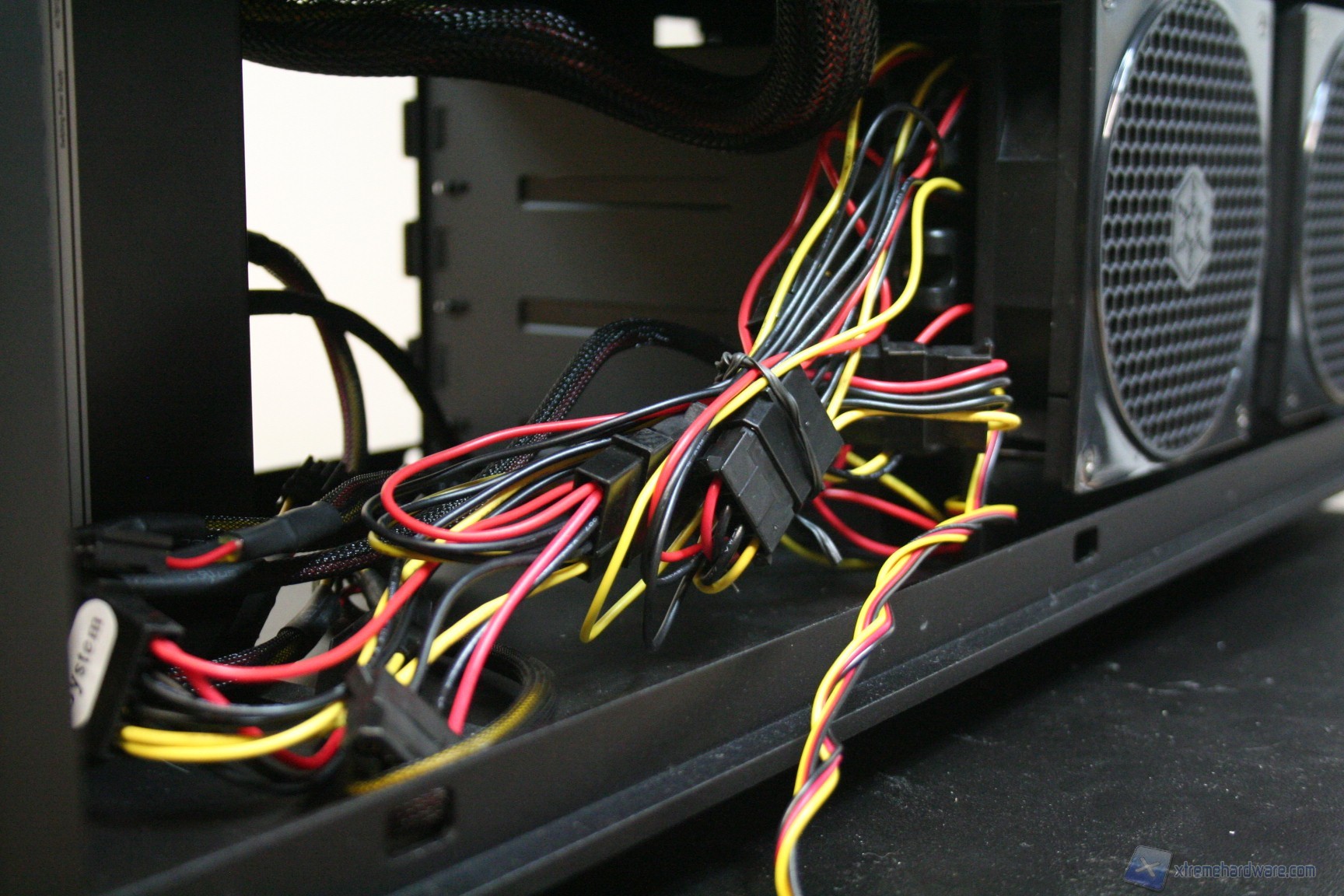 Fatto questo, consigliamo l’installazione dei dischi rigidi, facendo attenzione a posizionarli in serie nella struttura predisposta. Nelle foto precedenti potete osservare la modalità con cui abbiamo cablato i cavi originali, ripartendoli posteriormente dall’alto al basso. Consigliamo di utilizzare lo stesso metodo, per praticità, anche perché nella parte inferiore ci sarà un gran groviglio di connettori molex di alimentazione. Questo sistema andrebbe senza dubbio migliorato, ma il connettore CP06 sopperisce ampiamente a questa mancanza. Sarebbe interessante sfruttare contemporaneamente i connettori CP06 e CP05: probabilmente SilverStone proporrà in futuro una versione unificata. Una volta montati gli hard disk, sarà necessario montare il lettore DVD: dovrete togliere le mascherine frontali e sostituirle con l’unità ottica, per poi riavvitare e serrare lateralmente. Successivamente si passerà all’installazione della scheda madre. Se si possiede un dissipatore Intel, tramite il solito sistema push-pin, sarà possibile installarlo successivamente, altrimenti se volete potete già procedere ad installare il backplate del dissipatore della CPU, facendo attenzione a stendere un sottile velo di pasta termica alla base della CPU stessa. In sostanza, se la vostra scheda madre non è mini-ITX, dovrete prima montare i distanziatori nei fori per il formato ATX, serrarli molto bene – consigliamo una pinza larga 1cm durante quest’operazione, su ogni cabinet – e poi apporre la scheda madre, serrandola con le viti fornite nella confezione. Se avete un dissipatore aftermarket potete utilizzare il foro posteriore, che è molto pratico e vi aiuterà non poco all’atto della procedura. Dopo aver montato il dissipatore sulla scheda madre, sarà necessario montare la scheda video, le RAM ed infine procedere all’assemblaggio dei cavi di connessione del cabinet alla scheda madre. Per fare un lavoro pulito consigliamo l’utilizzo delle fascette restringenti fornite in bundle. Giusto a titolo informativo riportiamo il cablaggio eseguito posteriormente, ma state certi che con una maggiore cura ed attenzione ai particolari il lavoro sarà ancora migliore. Terminata l’operazione vi consigliamo di connettere tutte le ventole che avete a disposizione. Ecco qui come si presenterà il case a lavoro terminato.